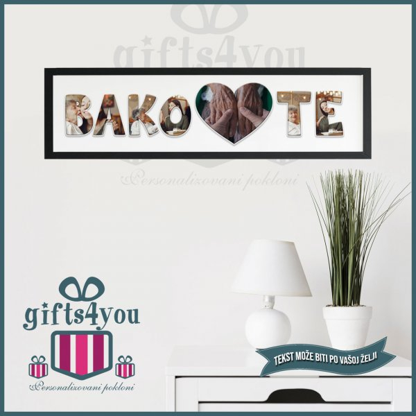 Ram sa slikama je jedinstven poklon koji je u potpunosti napravljen od Vaših fotografija. Dimenzije rama su 80x20 cm, dok su tanke lajsne rama drvene u crnoj boji. Broj slika koje sadrži jedan ram sa imenima zavisi od dizajna, mogu se raditi sa tekstom po želji.