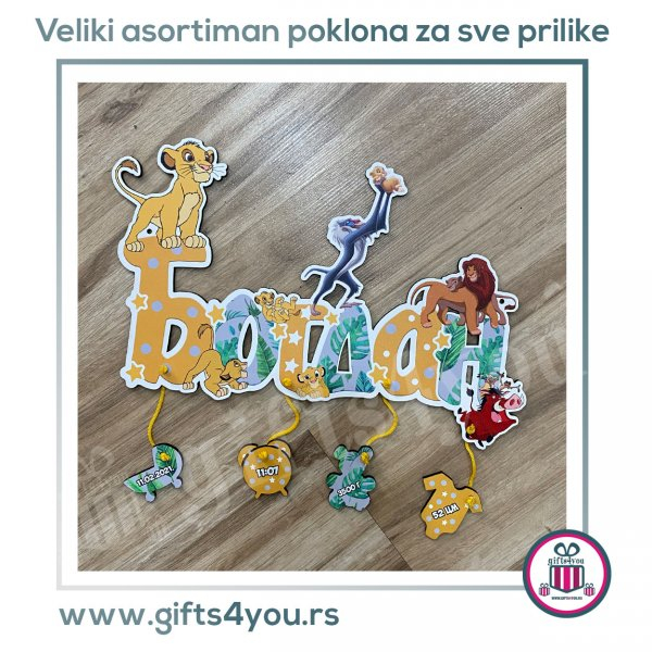 Poručite unikatan poklon sa imenom Vašeg mališana i njegovim podacima sa rodjenja, u kombinaciji sa ramom ili satom Za svaki naš poklon se izdvaja bitno vreme kako bi se dobio unikatan i personalizovan sat, njegova veličina je u proseku 42 cm u širinu, pravi se od kvalitetnog materijala sa jarkim bojama i daje fenomenalan utisak na zidu. Sigurni smo da će ovaj poklon sat oduševiti već na prvi otkucaj.