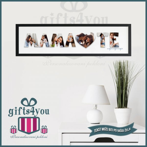 Ram sa slikama je jedinstven poklon koji je u potpunosti napravljen od Vaših fotografija. Dimenzije rama su 80x20 cm, dok su tanke lajsne rama drvene u crnoj boji. Broj slika koje sadrži jedan ram sa imenima zavisi od dizajna, mogu se raditi sa tekstom po želji.