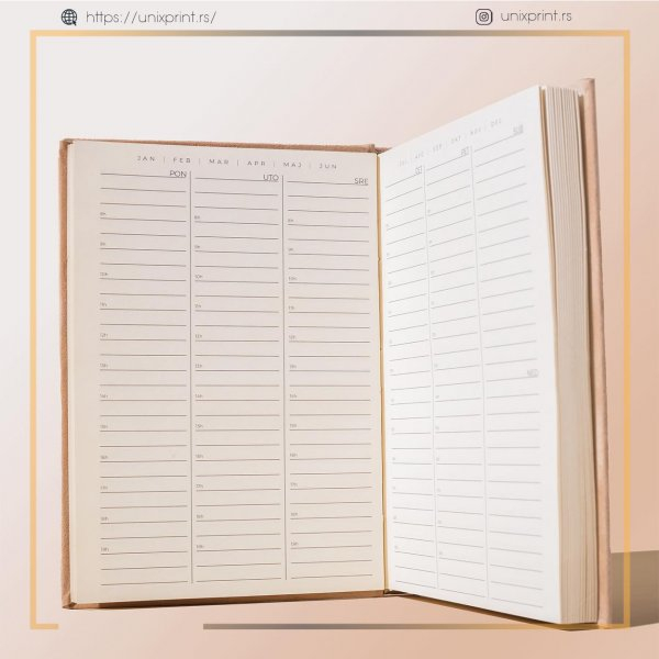 Plišani planer A6 formata - organizovan po danima i satima, nije obeležen godinom i mesecom.