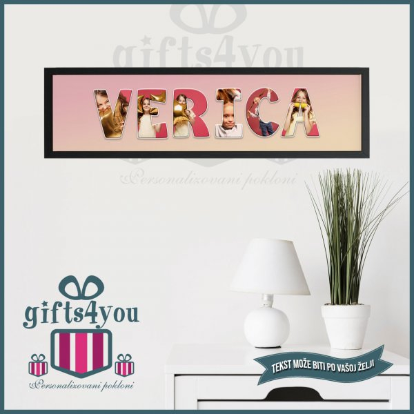 Ram sa slikama je jedinstven poklon koji je u potpunosti napravljen od Vaših fotografija. Dimenzije rama su 80x20 cm, dok su tanke lajsne rama drvene u crnoj boji. Broj slika koje sadrži jedan ram sa imenima zavisi od dizajna, mogu se raditi sa tekstom po želji.